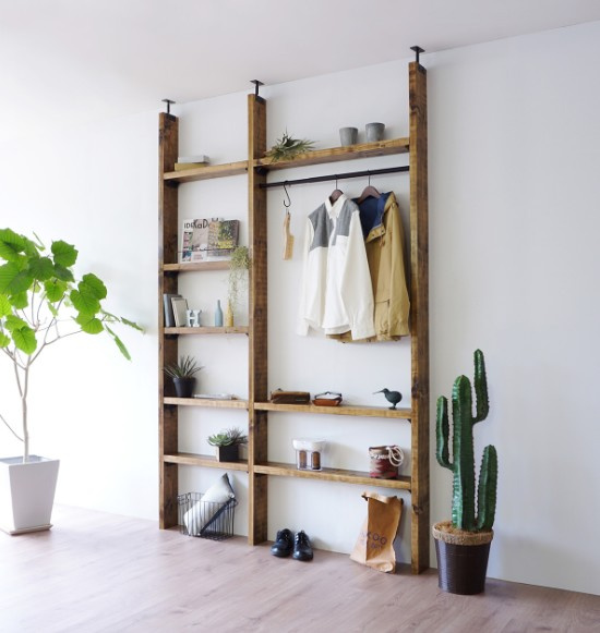 木なので、自分好みに塗装したりオイルを塗ったり釘を打ったり、2本立てて間に板を渡すと棚に、また パイプを通してクローゼットにしたりと工夫次第でサイズから雰囲気まで自分の部屋にぴったり合う収納をつくることが出来ます。
