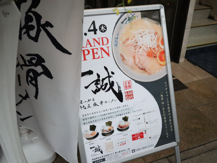 インスタでずっとOPENまでの軌跡を投稿されていた注目の新店「まつやま帆立豚骨ラーメン一誠」に行ってきましたよ、早速。大街道商店街の二番町と三番町の中間くらいの位置。エベレストフードさんのビルの1階です。