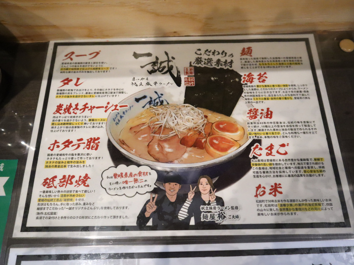 ビブグルマン5年獲得の京都の名店「麵屋裕」というお店の店主さんが監修したお店。愛媛県の食材に拘った1杯。(麺も愛媛県産の小麦を使用している)帆立出汁という珍しさ。器は砥部焼(温度が冷めづらい)着丼時の掛け声「たのしんで!」