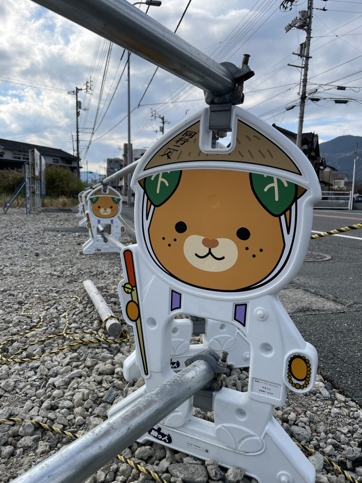工事現場の柵には、愛媛県のキャラクター みきゃん が登場。